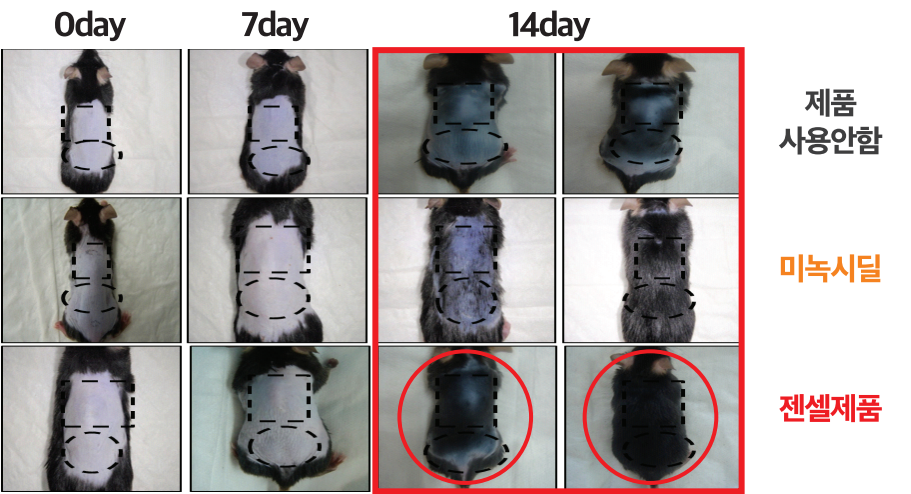 같은 부위를 면도 후 세계 유명 탈모치료제 미녹시딜과 젠셀 제품을 도포한 후 경과 관찰, 젠셀 제품 사용시 같은 기간 안에 더 많은 털이 굵게 자라난 것을 확인하였습니다.